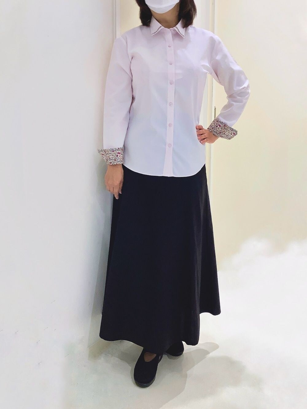オールシーズン使いやすいライトピンク生地。 薄めなピンクなので合わせやすさ抜群。 織り柄は控えめに、細い格子柄がさりげない。 襟のパイピングとステッチが顔周りの印象を華やかに。 季節の変わり目を楽しめる1枚になること間違い無し♪