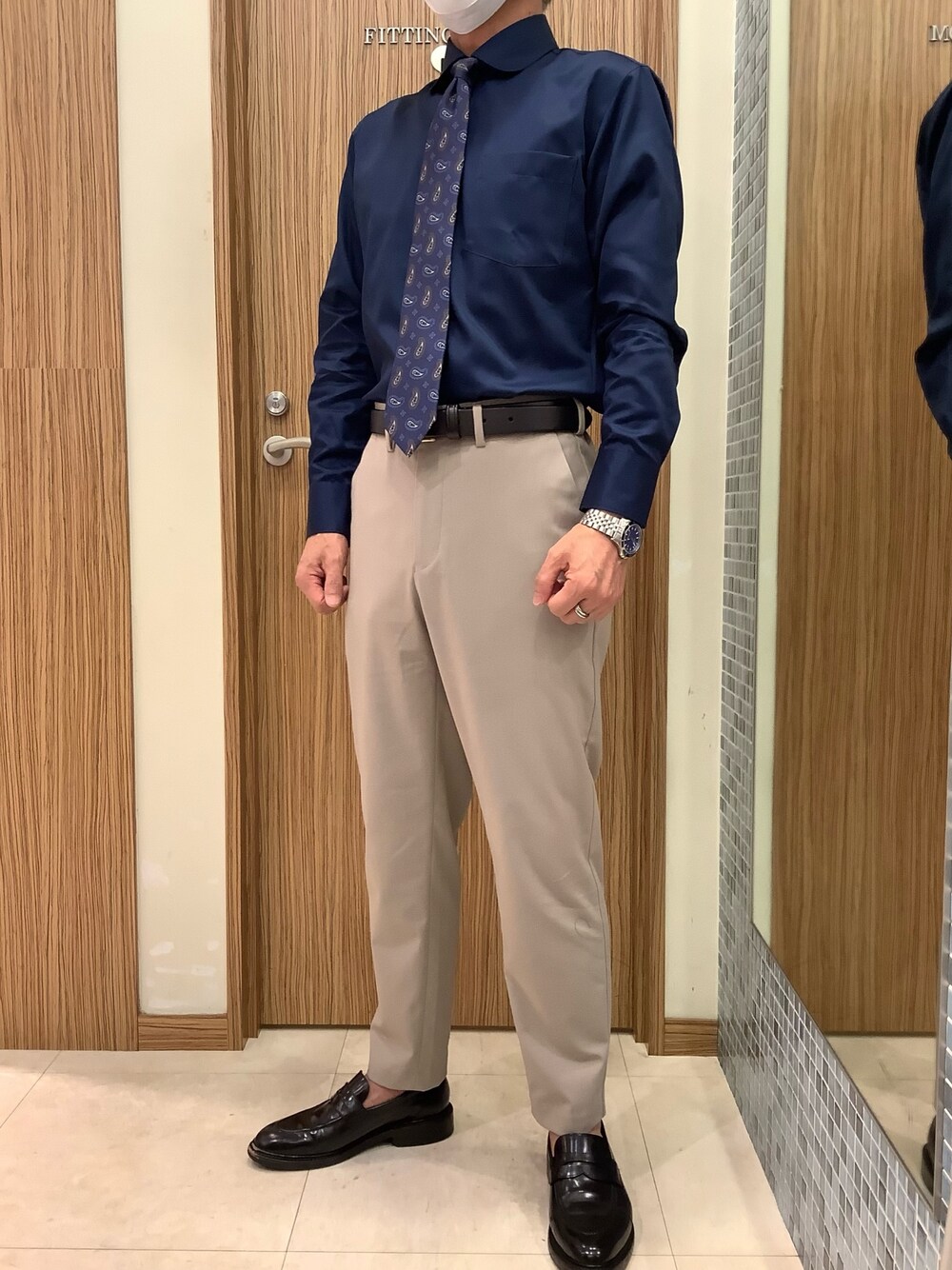 ネイビーシャツがスマートな印象を与えるコーディネートです
