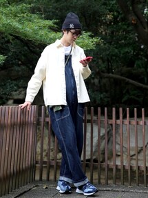 色を変えたデニムオンデニムコーデ♡ デニム調のニューバランスはこのコーデのためだけに購入しました!!笑 ちょっとゆったりシルエットにして、 さらにニット帽を被ることでストリート感も出してます😎