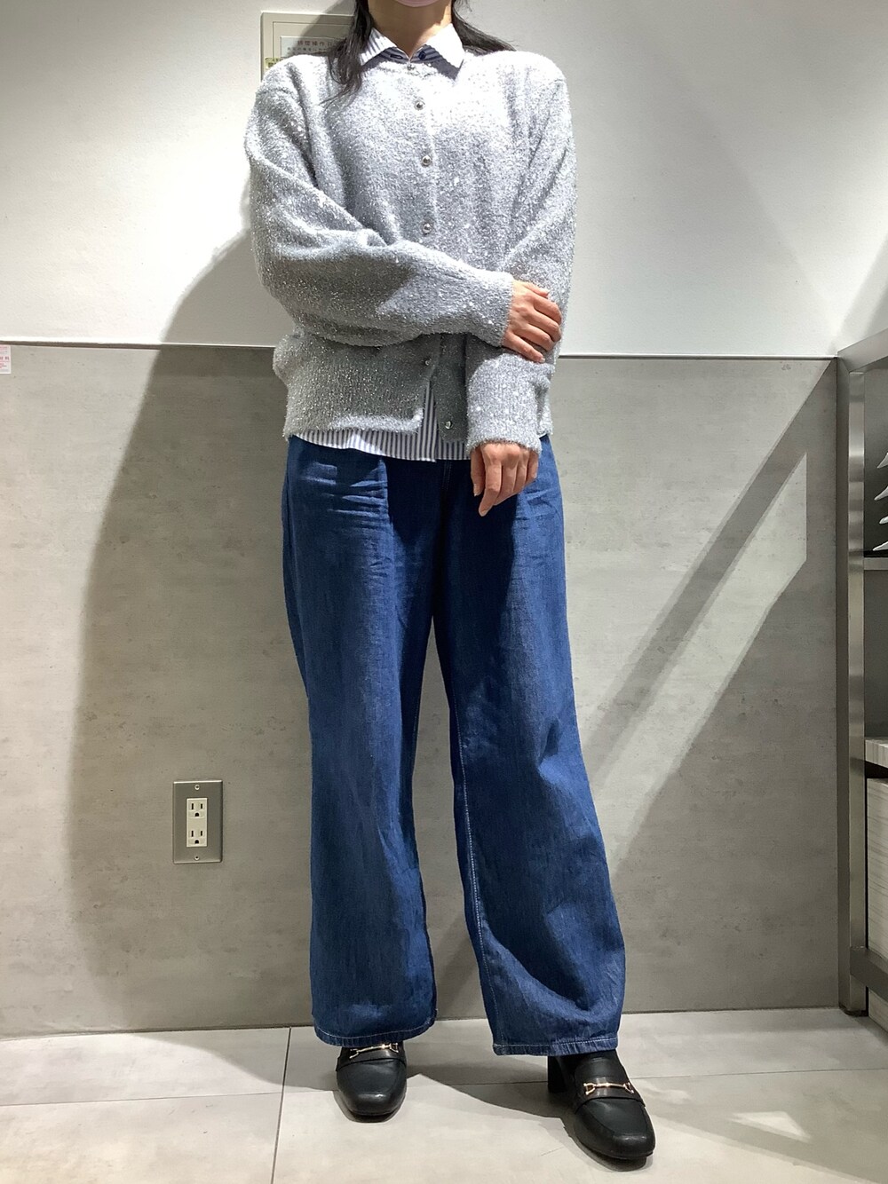 キラキラのラメ入りカーディガンをカジュアルに。 インナーには定番のロンドンストライプを合わせて、襟をチラ見せ。 今回はカジュアルにコーデしましたが、これからの時期に増えるお食事の席にもオススメ。 ボトムをサテンスカートにしたり、ワンピースの上に羽織ったりと万能に使えます😊 暗くシンプルになりがちな秋冬のコーデに華やかさを一点投入!