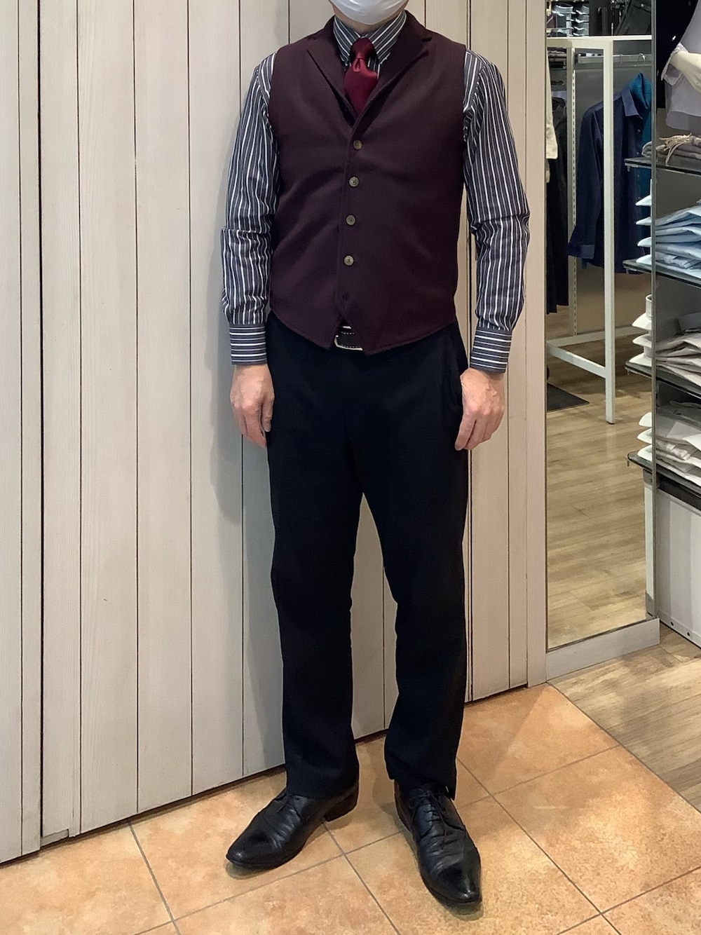 黒ベースに白ストライプが個性的な1枚👔 シャツのみのコーデもカッコよく決まりますが 無地系のネクタイやジレと合わせても◎ ボルドーカラーをプラスして見た目にも暖かな冬コーデに。