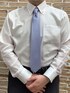 一見シンプルな白シャツですが、 ポケットとカフスの刺繍に遊び心が♪ サックスブルーのネクタイで清涼感あるコーデにしました。