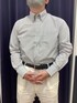 シンプルなグレーストライプの身生地は コーディネイトアイテムを選ばず 様々なスタイリングができます。 ボタンダウン衿はタイドアップでの着こなしもおすすめです。