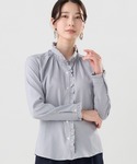 前立てから衿周りかけてのフリルが華やかなブラウスです✨ グレーの細かいチェック柄が入ったの生地なので、畏まった場面はもちろん、カジュアルな場面でもお使い頂けます^_^ ゆったりとしたジャンパースカート と合わせて秋らしいお出掛けコーデで♪