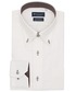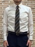 クリーム色のドゥエボットーニボタンダウンシャツにレジメンタル柄のネクタイを合わせました。 意外と探すと見つからない、クリーム色のシャツ。 綿100%で超形態安定加工が施されているので、着心地とお手入れの楽さを両立出来ます。 他人と被りたくない方にはオススメです。
