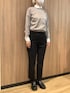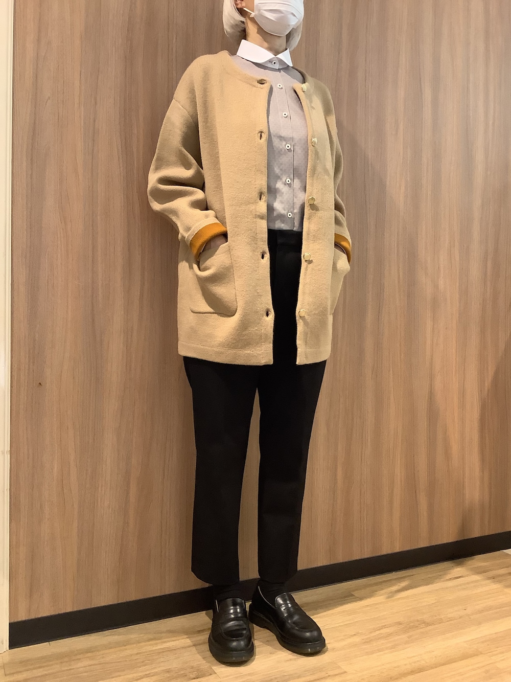 軽くて暖かなベージュカラーのニットコート。ラウンドの白襟クレリックシャツを合わせ女性らしい優しい印象にしてみました❤︎