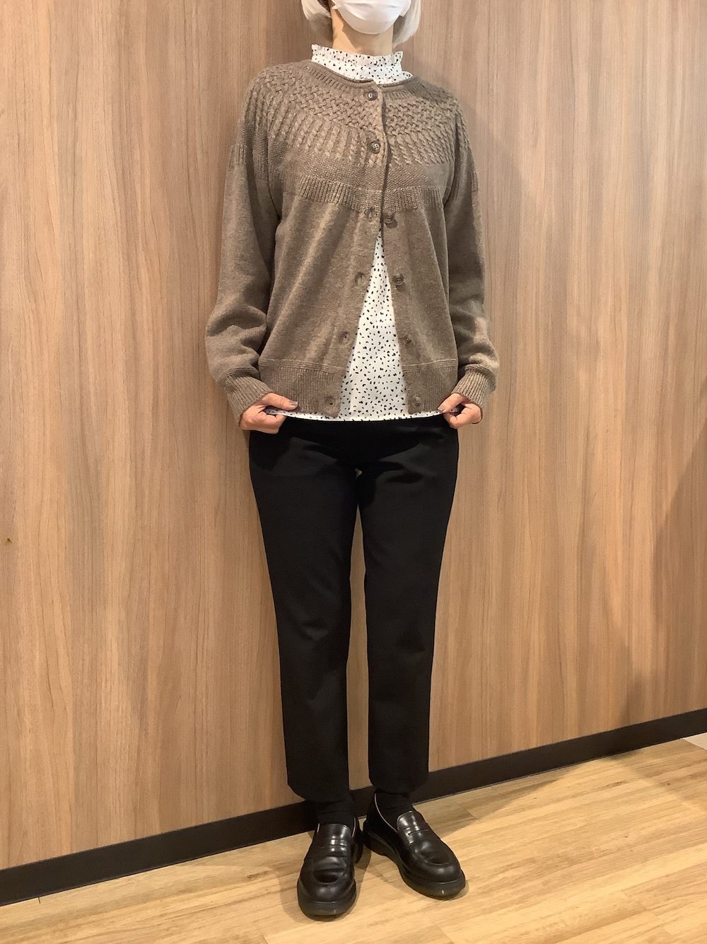 ラムウール混の暖かで柔らかなカーディガンは求心織り柄がアクセントに。 フリルブラウスの首元をいかしたキュートなコーデに仕上げました❤︎