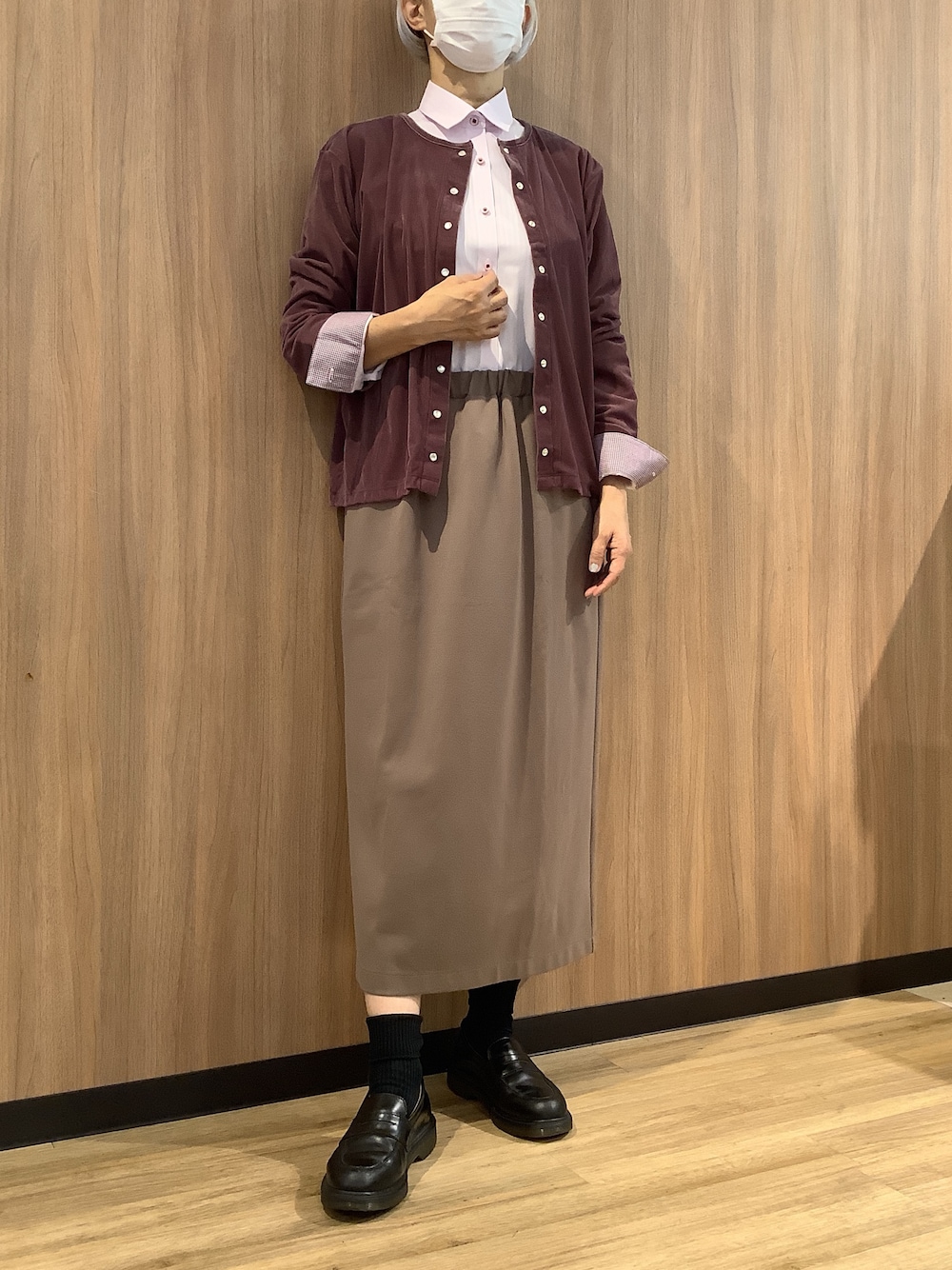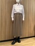 落ち着いたブラウン系コーデ🍂 ピンクのシャツを差し色に重くなりがちな秋コーデに華やかさをプラスv シンプルながらきちんと感がらありオフィス、お出掛けと共に楽しめるスタイルです。 カーディガンはベロア調の柔らかなで伸縮性があり重ね着に◎ シャツは形態安定でお手入れ楽ちん♪