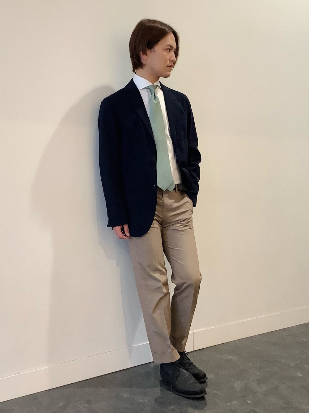 Model 167cm 着用サイズ Jacket→M Shirts→S-80 ブレザーにチノパン パステルグリーンのネクタイを使った 春らしいスタイリングです🌸☘️ 若さがあるフレッシャーズらしい コーデをイメージしました☺️ シンプルな白シャツは コットン100%仕様で 肌に吸い付くような生地感🛏️☁️ 着心地も動きやすく ジャケットの袖通しも良いので ストレスフリーで快適に✅ また襟はホリゾンタル仕様で ノータイも可能な襟で オールシーズン使いやすいシャツです👔