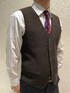 シンプルなストライプシャツにワインレッドのタイとブラウンのジレを合わせ暖かみを感じるコーディネートにしました。