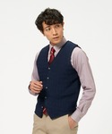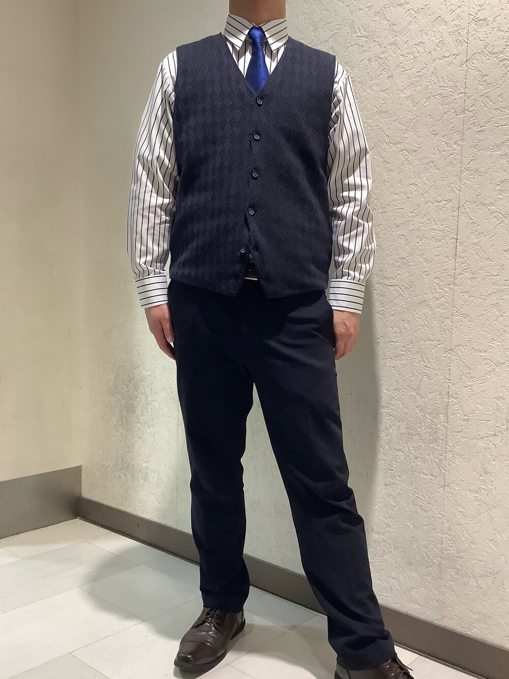 重くなりがちな濃い色のニットには大きなストライプシャツと発色が良いブルーのネクタイを合わせ明るさを出しました。