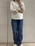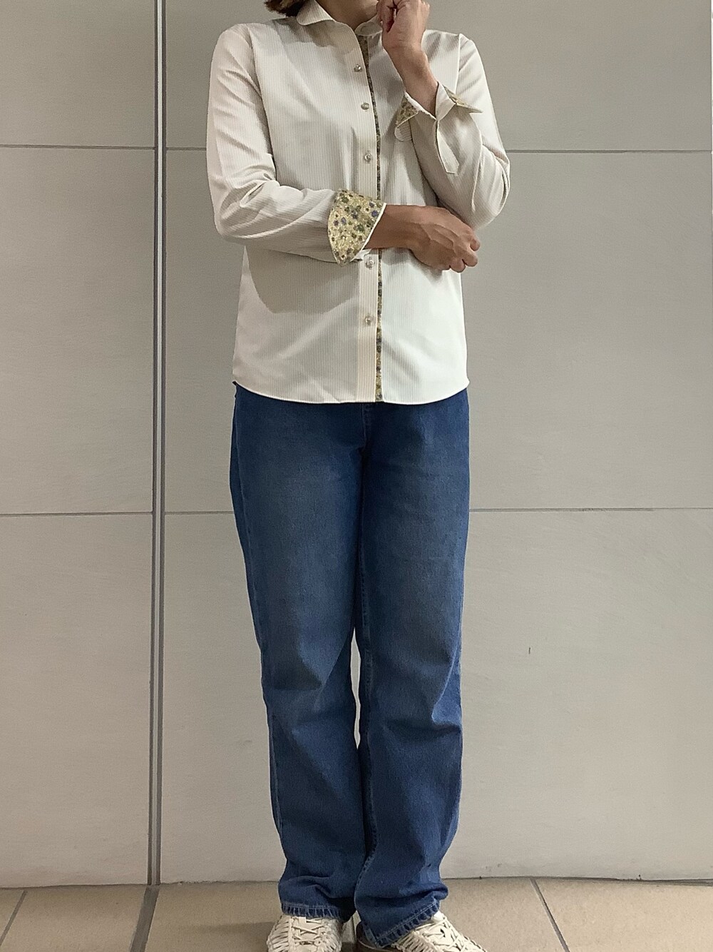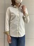 秋らしい色のシャツを着用しました。 カジュアルにラウンドカラーで 前立てに柄があるのでボタンを開けたり 閉めてフォーマルにも⭕️ 衿と袖が別生地なのでアクセントにも なります。