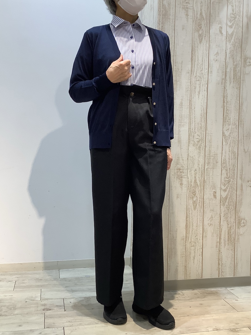 肌触り柔らかく、ナチュラルなストレッチがあり着心地抜群です☆ シワになりにくく、お手入れ簡単です♪ ネイビーのカーディガンは薄手なので今の時期にあると嬉しい一枚です☆