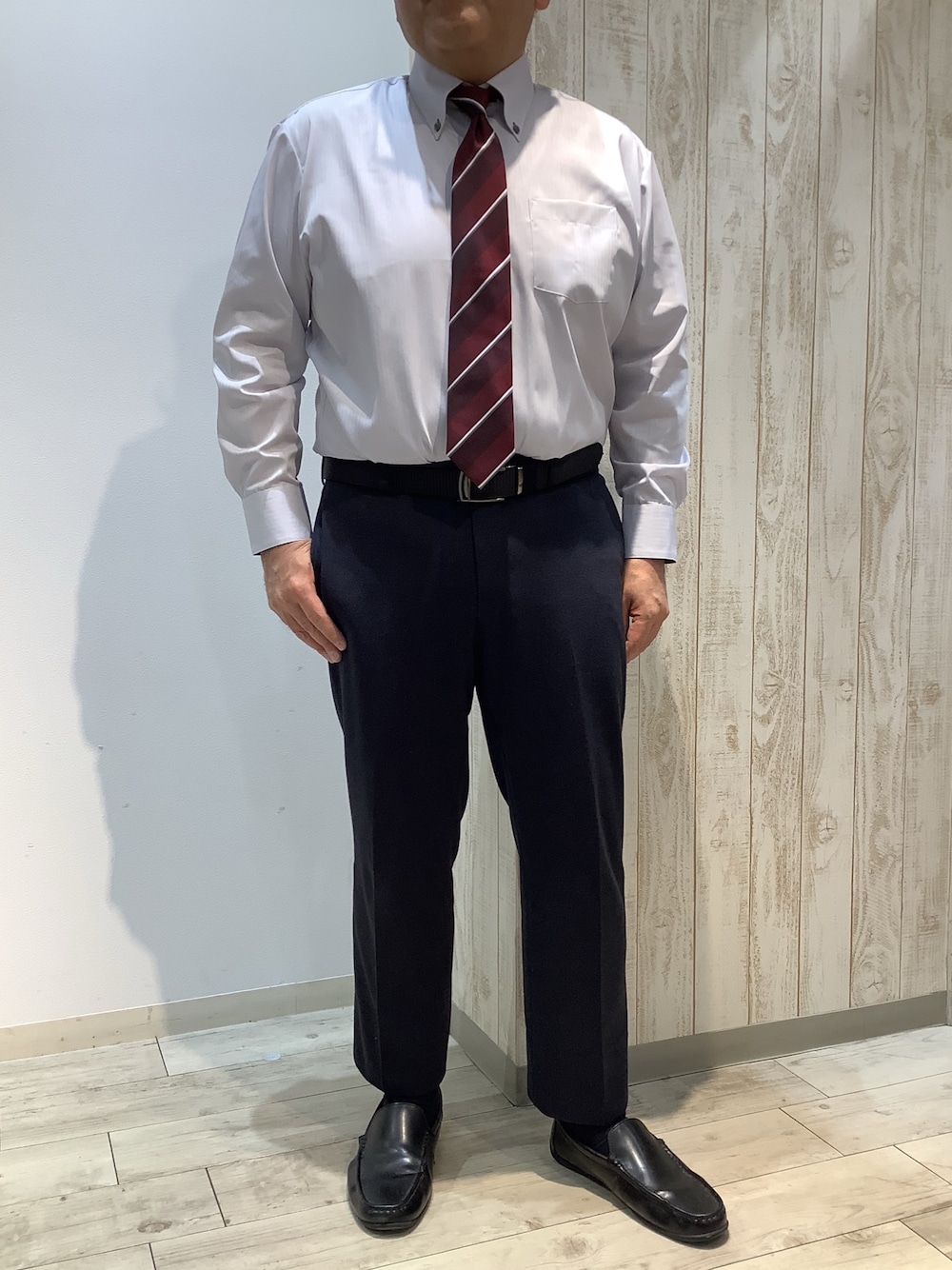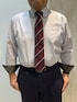 グレーの織柄のシャツにエンジ色の ネクタイで合わせて見ました♪ 別生地がペイズリー柄になっているのが、 このシャツのポイントで、チラッと見せる のもおしゃれ感UP😊 超形態安定シャツですので、お手入れ簡単、 オススメの1枚です👍