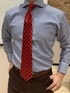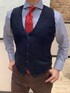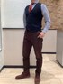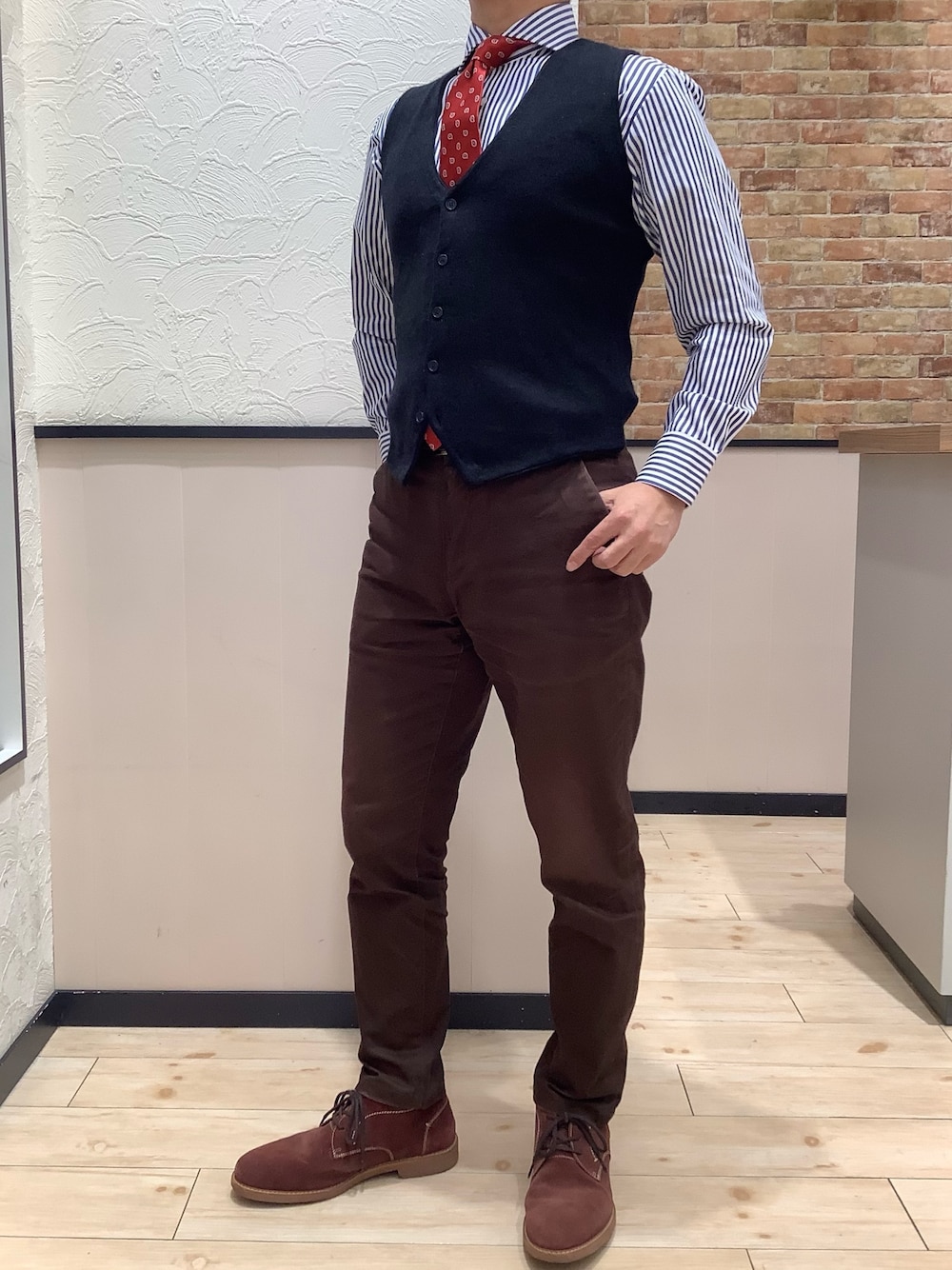 定番の白×ネイビーのロンドンストライプ・シャツにニットジレ。 オレンジのネクタイを合わせて、おしゃれコーデです。 ホリゾンタルカラーのシャツなので、ノーネクタイにもおすすめ。