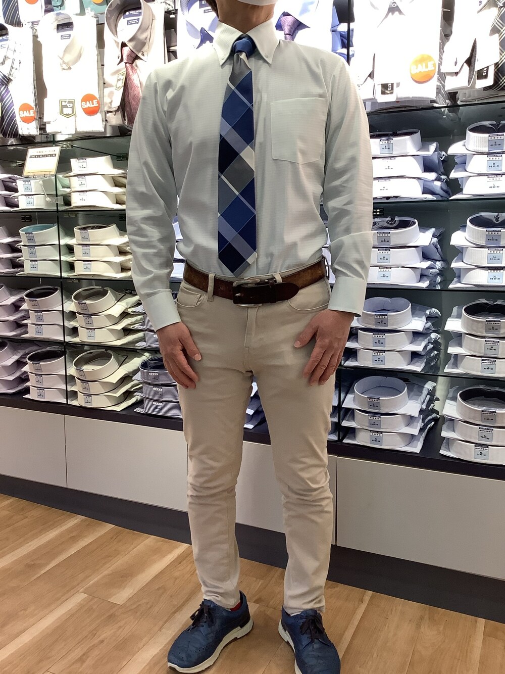 ライトグリーンのパステル色は、春先のコーデとしてピッタリ。チェックのネクタイとセットで柔らかな印象を与えます。