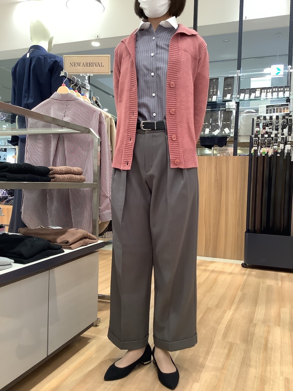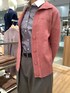 グレーのシャツとパンツのコーデに ピンクのカーディガンを差し色でオン🧶 程良いゆとりのカーディガンは 腰回りまでカバーできる丈で 安心して着られる1枚です✨