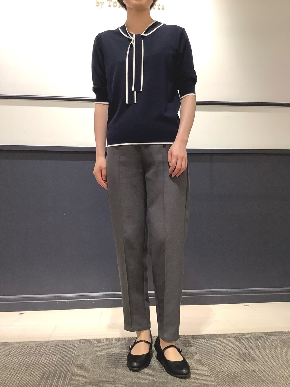 結び方で印象が変わる、ボウタイニットのプルオーバーです。シンプルな一つ結びにパンツで合わせて、オフィスカジュアルスタイルにしました。