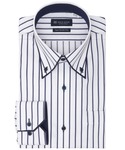 はっきりとしたチョークストライプ柄のシャツに、さり気なくパイピングデザインが施されています。 白地にネイビーというスーツとも合わせやすい色使いで、いろいろ着回ししやすいのも◎です。 超形態安定加工により防シワ性にも優れています。