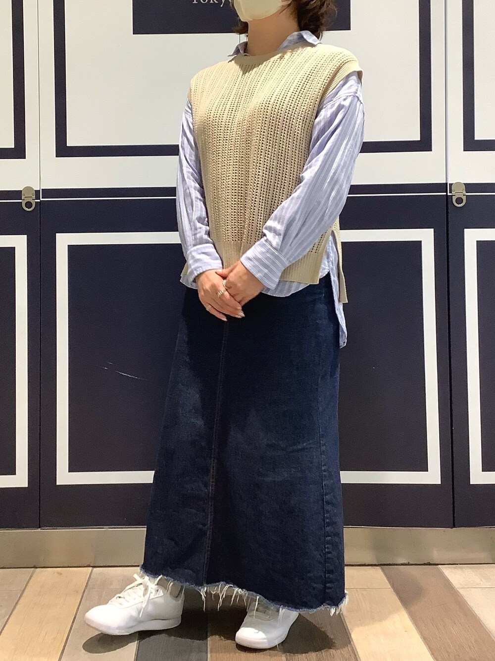 シャツ&ベストでキレイめに。 デニムスカート&スニーカーで カジュアルに。 バランスよくまとめました✨ 爽やかブルーストライプシャツと 柔らかベージュ透かし編みベストは 相性抜群です!!