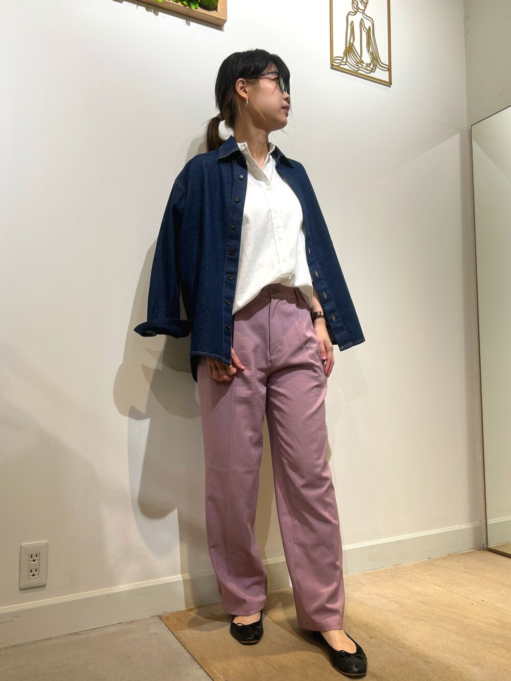 スタンドカラーガーゼシャツにインディゴブルーのデニムシャツを羽織って 秋のキレイめカジュアルコーデを意識しました🌝 ボトムは派手すぎず履きやすいスモーキーピンクのカラーパンツで程よく差し色♪