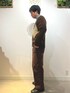 全体をブラウンベースに、インナーはグレータートルで全体を落ち着いた雰囲気になるよう意識したコーディネート。