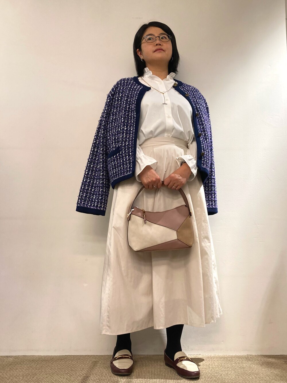 163cm ブラウスLサイズ ジャケットLLサイズ 着用 たまには夫婦でクリスマスランチでも行こうコーデ🎄 キャンディスリーブがかわいいフリルブラウスと白のボリュームスカートを合わせて甘めにし、多色使いのツイード風ジャケットで少し大人成分をプラス✨
