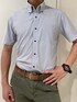 ストレッチの効いたブルー×グレーの半袖ストライプシャツです!✨伸縮性があって動きやすく、一度着るとシャツのイメージが変わります!こんなに楽なシャツがあったんだ!と!襟裏にもデザインがあり、汗や汚れが目立ちにくいのも◎!👍