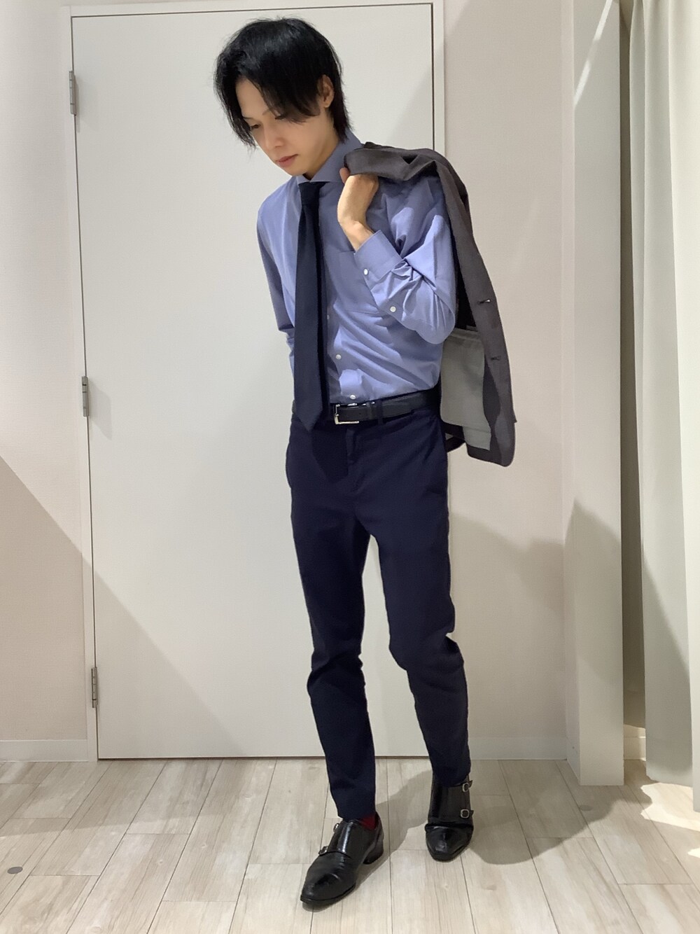 ストレスフリーな着心地のストレッチシャツに、季節感のあるウールネクタイを取り入れたシンプル青コーデ!✨窮屈さを感じずにササっと着用できる楽々なオススメシャツです!