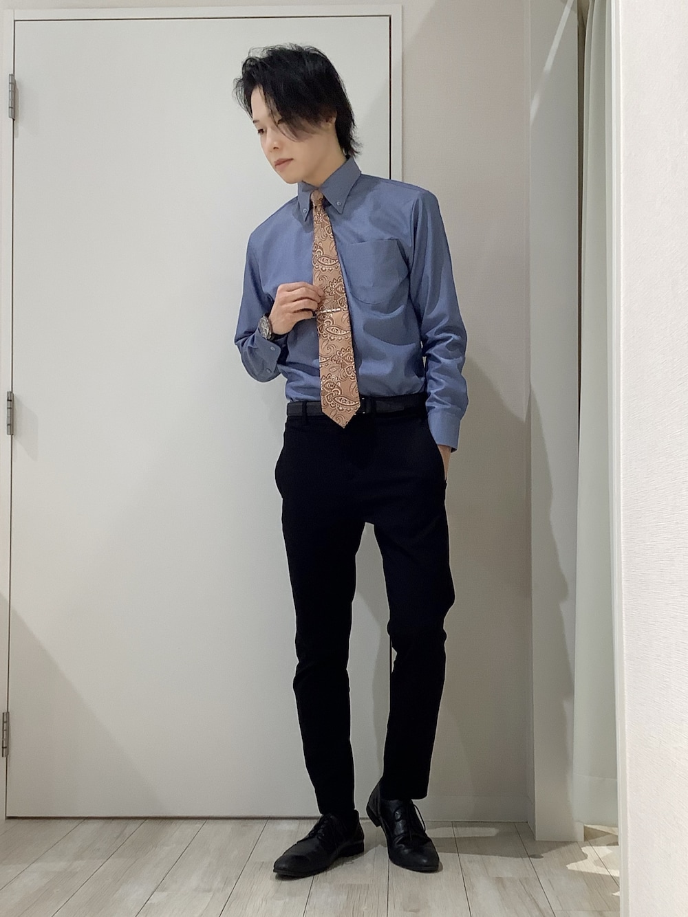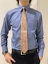 綿100%の着心地が良い青シャツに、 反対色のオレンジ系ペイズリーネクタイをチョイス!✨ 程よいアクセントが効いて華やかになります◎!