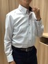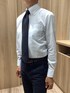速乾性に優れたポリエステル混で毎日楽に着られる一枚✨ 台衿・カフス裏の別布や色ボタンもさりげないアクセント♪ ネイビーのドットタイで、品よく個性を演出‼️