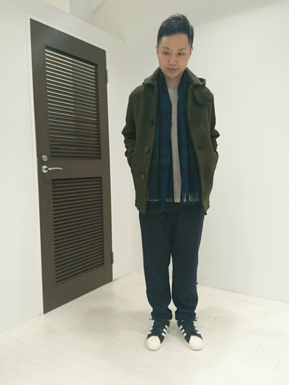 ORCIVALのオリーブ色のコートに、ブラックウォッチ柄のマフラーがさりげなくアクセントに!! 同じトーンで合わせることにより上品にコーディネート出来るのでオススメです。