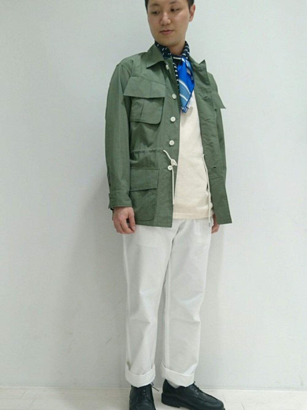 AURALEEのオリーブのファティーグジャケットに、ORCIVALのパンツとカットソーは、ホワイトとベージュの明るめのトーンで上品にコーディネートしました。 スカーフを首元にプラスして、淡い色味を引き締めアクセントに!!