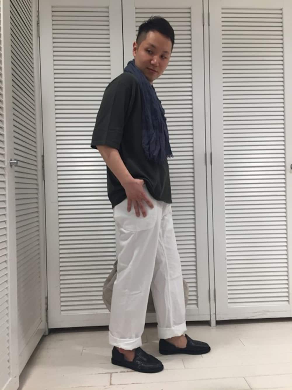 ROBERTO COLLINAのゆったりとしたコットンセーターは、ワイドパンツをロールアップして合わせリラックス感あるコーディネートがオススメです!! 首もとにストール、足元にはレザースリッポンを合わせて上品な印象に。