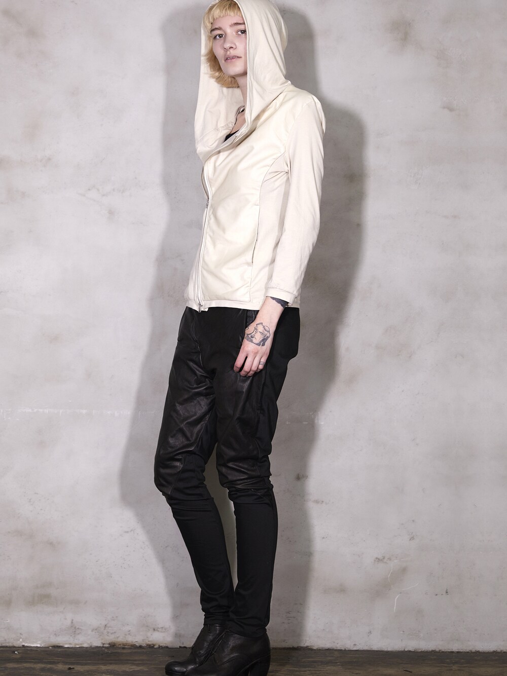 3種類の型、3種類の色から選べるヒューイ。今日はフードタイプをご紹介。レザーとコットンのコンビネーションは重苦しくなく、デイリーに着こなせる万能ウェアです。中でもフードは着回しの良さから手放せない存在ですね。 姫路サロンに各パターン、サイズ取り揃えていますので、お気軽にご試着にお越し下さいませ。