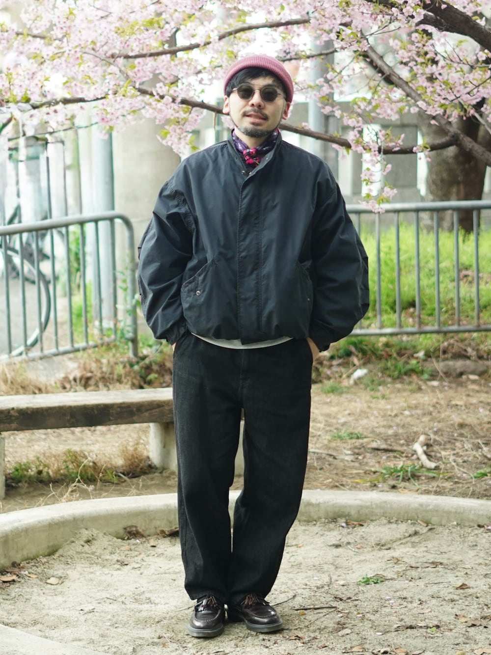 ▼着用アイテムのサイズ詳細 👤 体型 身長:168cm 体重:65kg 特徴:肩幅やや広め 🧥 アウター ショート丈モッズ/journalstandard/S 実寸:着丈62cm/身幅74cm/肩幅60cm シルエット:ゆったりワイド、ショート丈 👖 ボトムス ワイドテーパードジーンズ/uniqlo/M 実寸:股上33cm/股下67cm/わたり幅30cm/裾幅21cm シルエット:ややワイド、ややテーパード 👟 その他アイテム ・帽子:ニット帽/racal ・シューズ:ローファー/dr.martens ・アクセサリー:バンダナ/SHIPS 🔍 シルエットの見え方 トップスはゆったりワイドで、ジップと裾を少し絞ることで全体がシンプルにまとまるよう意識してみました。ボトムスはややゆったりしたテーパードで、全体としてOラインシルエットのようなバランスを意識してみました。 💡 スタイリングのポイント まだ寒さは残りますが、桜が咲いていたのでできるだけ春らしさを意識しました。 上下はブラックでまとめつつ、ニット帽とバンダナのピンク、ローファーのチェリーレッドを差し色として取り入れてみました。