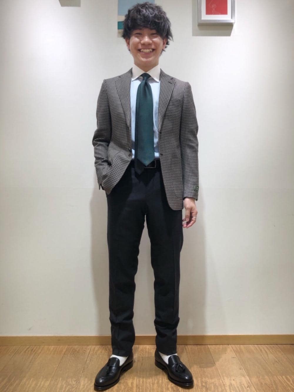 【身長167㎝ 着用サイズ ジャケット:44/シャツ:39㎝/パンツ:S/シューズ:38/ベルト32inch】 チェック柄のジャケットを引き立たせるため、シャツやネクタイはベーシックにコーディネートしました。 足元はハズしでタッセルローファーを合わせることでちょうどいいこなれ感が出ます。