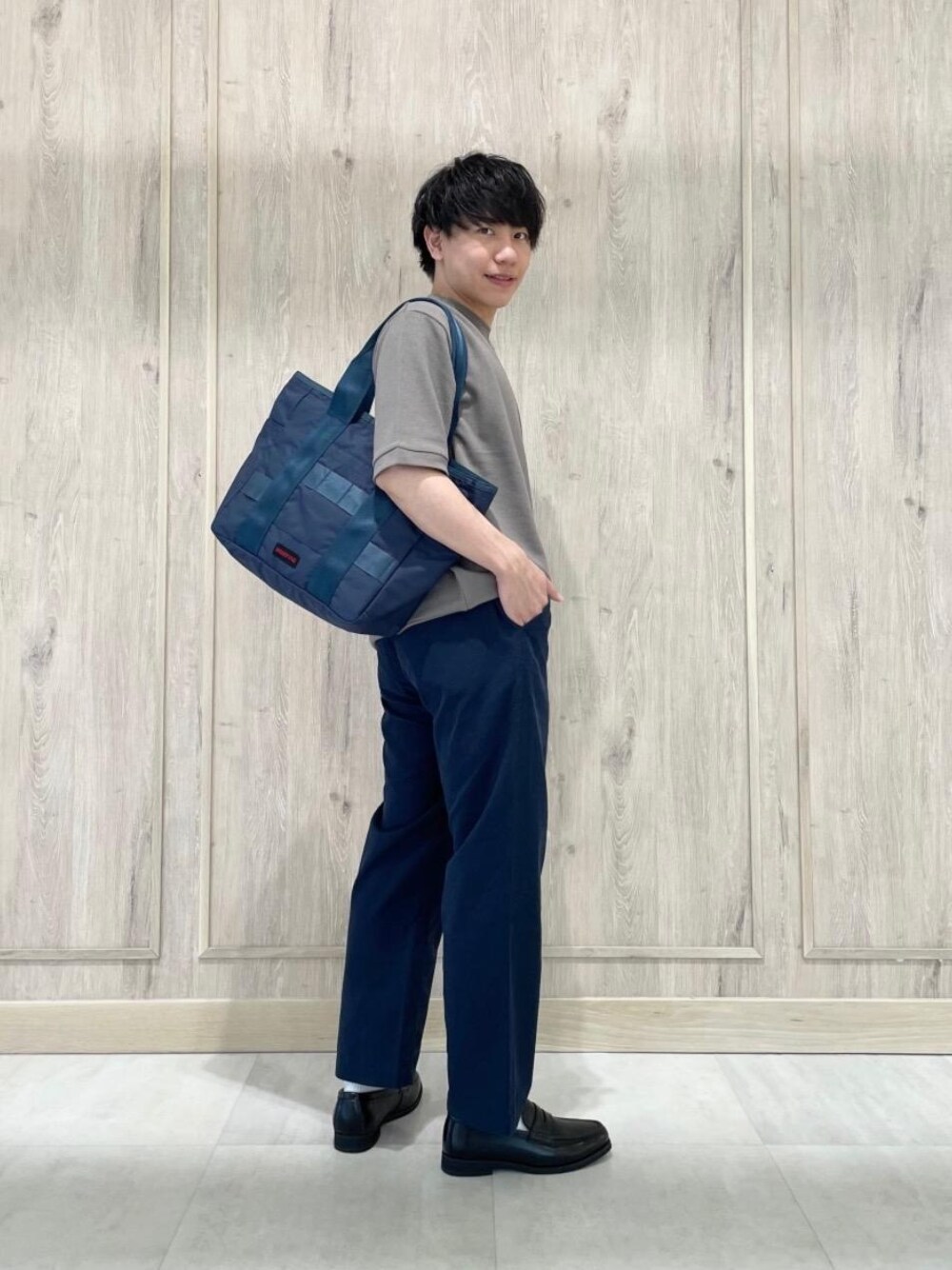 【身長】 167㎝ 【普段サイズ】 トップス:S(44)/ボトムス:S(76)/シューズ:26cm 【サイズ感】 カットソー:ややゆったり ボトムス:ややゆったり シューズ:ややゆったり 【コーディネートポイント】 袖や、裾にリブが付いたニットライクな表情のキレイめなカットソーに、シボ感のあるボトムスを合わせたスタイリングです。 ボトムスとバッグの色目を統一して落ち着きのある大人な男性をイメージしました。