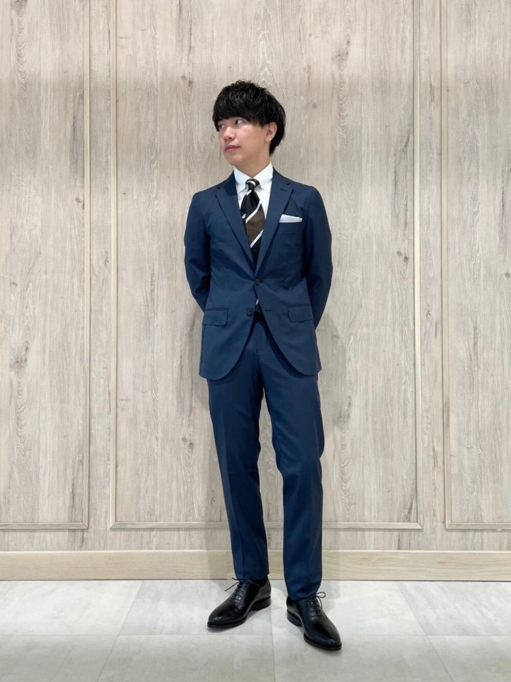 【身長】 167㎝ 【普段サイズ】 トップス:S(44)/ボトムス:S(76)/シューズ:26cm 【サイズ感】 ジャケット:標準的 シャツ:標準的 ボトムス:標準的 シューズ:標準的 【コーディネートポイント】 鮮やかなロイヤルブルーのスーツにシックな色合いのレジメンタルタイを合わせました。 足元は〈Jalan Sriwijaya〉のストレートチップで紳士的な装いにいたしました。
