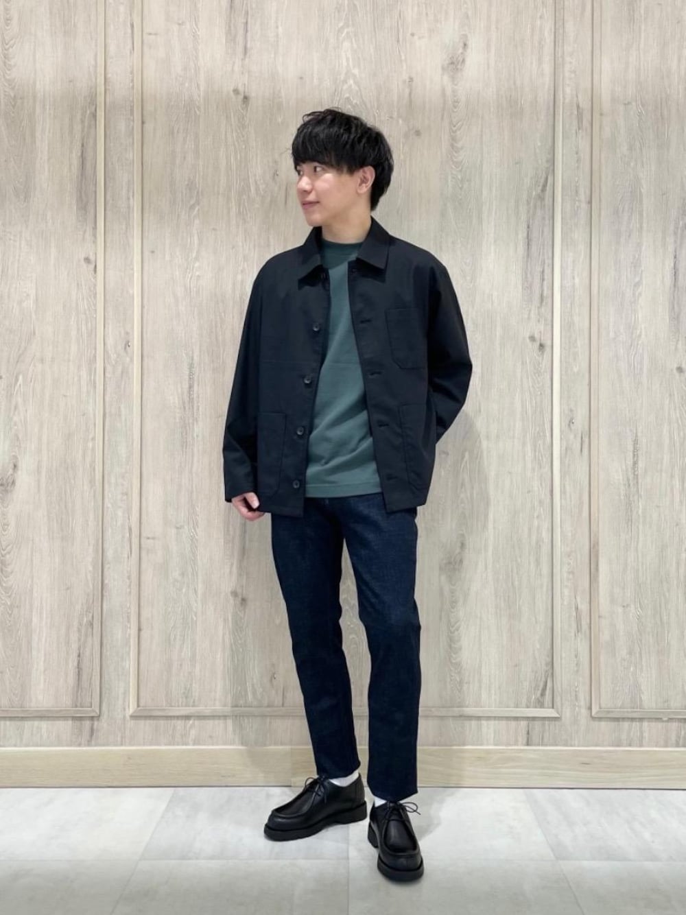 【モデル】 167cm / 60kg 【普段サイズ】 トップス:S(44)/ボトムス:S(76)/シューズ:26cm 【サイズ感】 アウター:ややゆったり カットソー:ややゆったり ボトムス:細身 シューズ:標準的 【コーディネートポイント】 ワークテイストのアイテムをキレイめに組み合わせました。 カバーオールは元々ワークウェアですがこちらはTWサージ生地を使用し、GLRらしく落とし込んだアイテムの為、スラックスと合わせてより品のあるコーディネートもおすすめです。