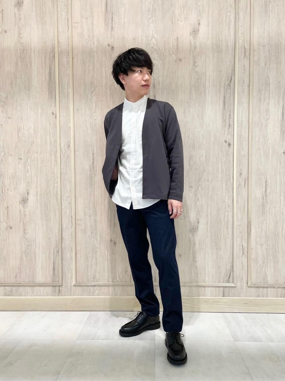 ●身長:167cm ●体重:60kg 【普段サイズ】 トップス:S(44)/ボトムス:S(76)/シューズ:26cm 【サイズ感】 カーディガン:ややゆったり シャツ:標準的 ボトムス:標準的 シューズ:標準的 【素材感・着心地】 カーディガン:表裏で配色が楽しめるダブルフェイス生地です。 【コーディネートポイント】 表裏の配色になっているカーディガンをシャツの上に羽織ったキレイめのスタイリングです。 カーディガンはボタンレス、シャツはバンドカラーを選ぶことで程よい抜け感が出ます。