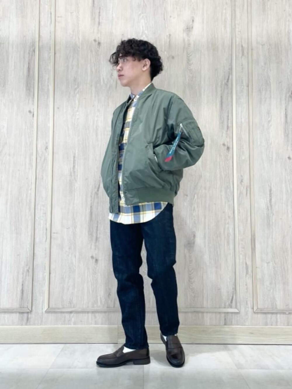 ●身長:167cm ●体重:60kg 【普段サイズ】 トップス:S(44)/ボトムス:S(76)/シューズ:26cm 【サイズ感】 アウター:ゆったり シャツ:ゆったり ボトムス:標準的 シューズ:標準的 【素材感・着心地】 アウター:L-2B型をベースにリラックスフィットに変更しています。 シャツ:自然なゆとりがあるシルエットです。 デニム:定番のコットンデニムです。 【コーディネートポイント】 全体的にアメリカンテイストでまとめました。 トップスのサイジングはモダンにリラックスフィットで合わせ、足元はローファーを合わせてスタイリングを引き締めました。