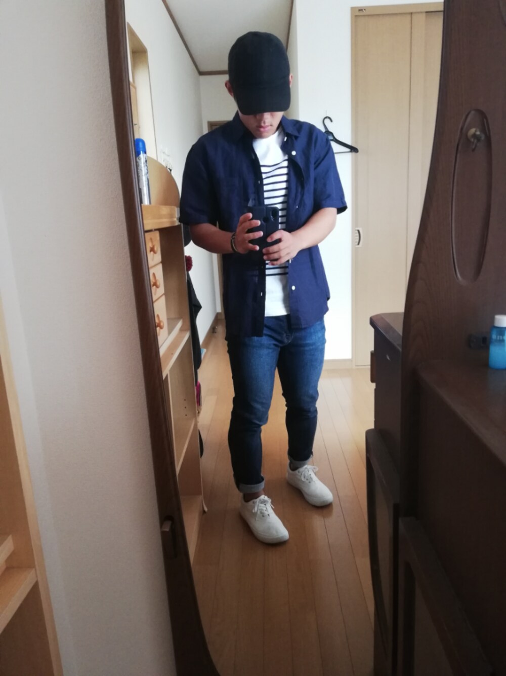 今日のコーディネートは超シンプルな感じにしました!たまにはこうゆうコーデもいいと思います! シャツが開襟シャツとかだった方がトレンド感が出せてもっといいのかもしれませんがこのシャツもボタンが白だったりと可愛さ満点です❗足元のロールアップでさらに可愛さupです!😁 白スニーカーにすることでいっきに明るいコーディネートになるとおもいます!