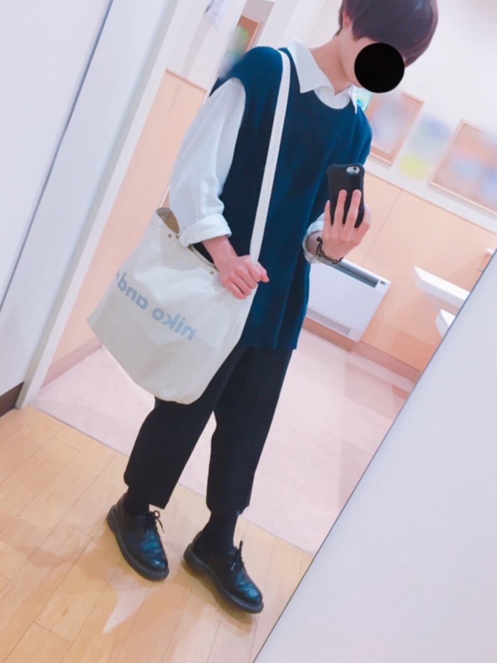 最近 暖かくなってきたんでニットベストを買いました🙂 学校 帰りに撮ったんで教科書でトートバッグがパンパン😅