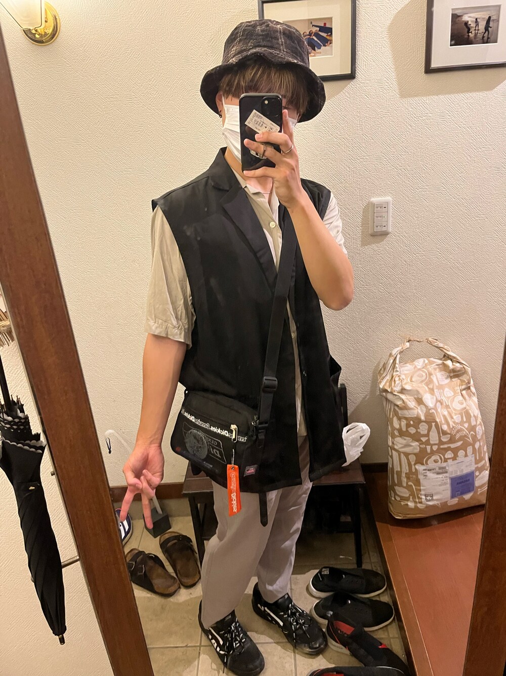 ベージュセットアップジレ綺麗めバケハ黒をところどころそえて、いや後で気づいたけどそでシワシワで草