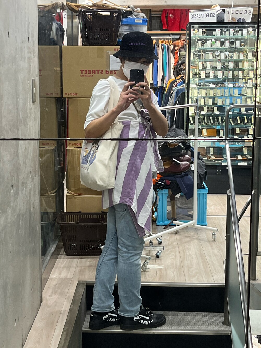 パープル系のシャツ/ブラウスを着用したメンズの秋コーディネートの1枚目の写真