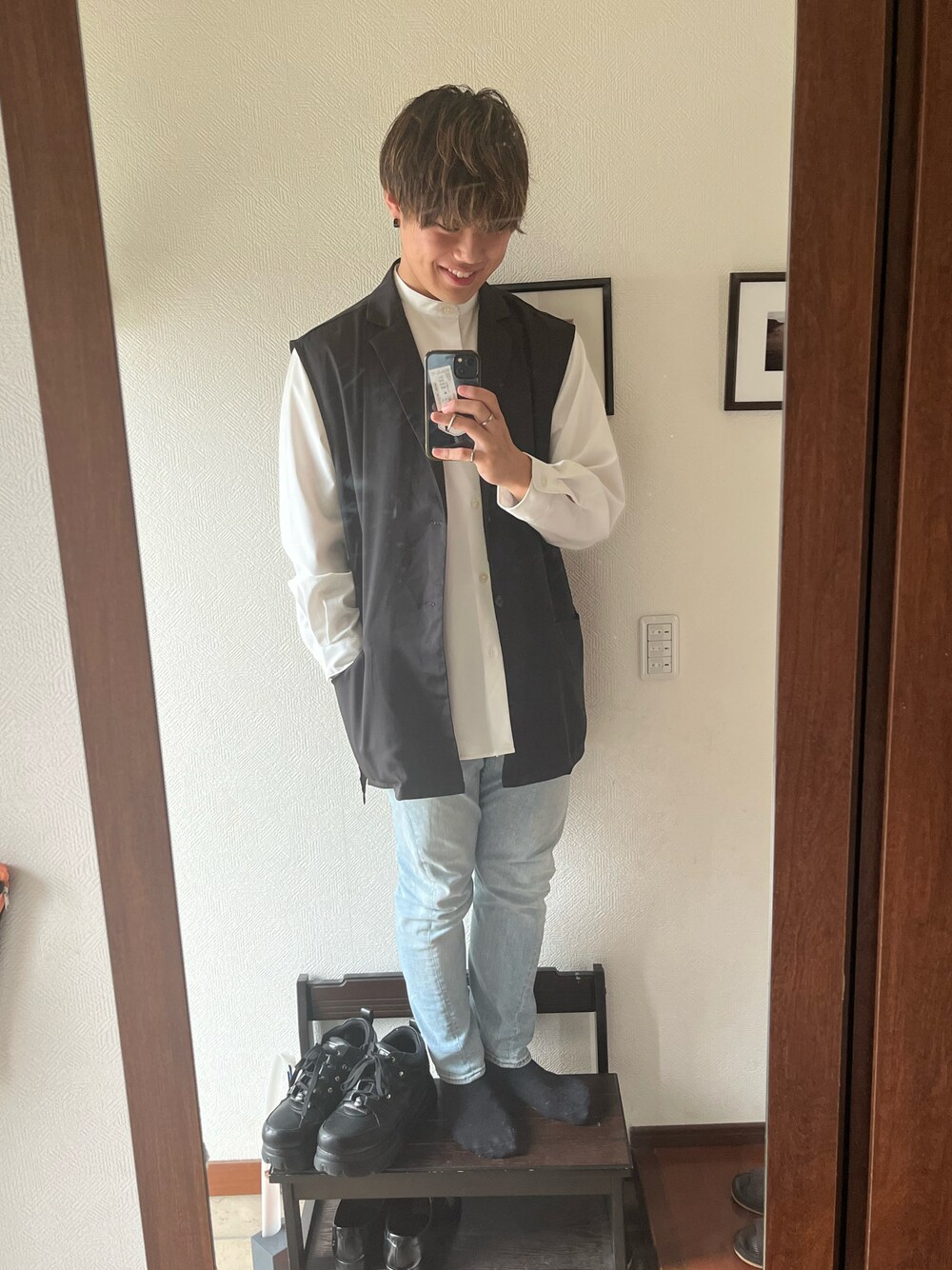 ジレはzozo スタンドカラーシャツ白で 薄ジーパン 靴で盛る 最近固くなりすぎた指の皮が取れてギターが痛くて弾けん。ぴえん。