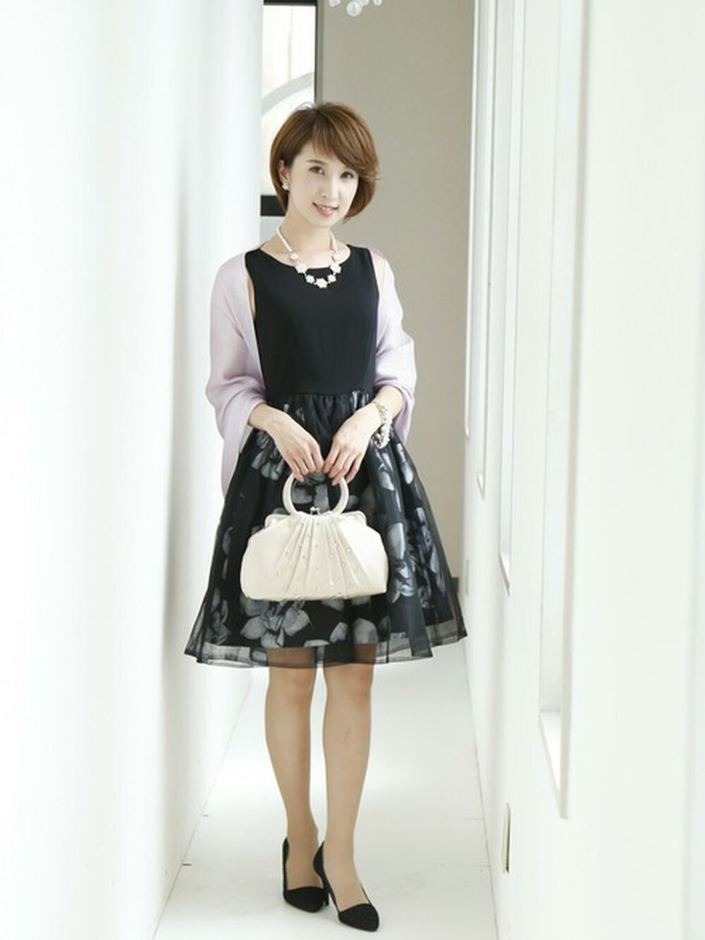 フラワープリントにブラックチュールで大人かわいいドレスコーデ! モノトーンなのでラベンダーショールを差し色に羽織りました~ 可愛すぎないのでおすすめです(^◇ ワンピースはこれからの時期ニットをレイヤードして冬にも着れますー!