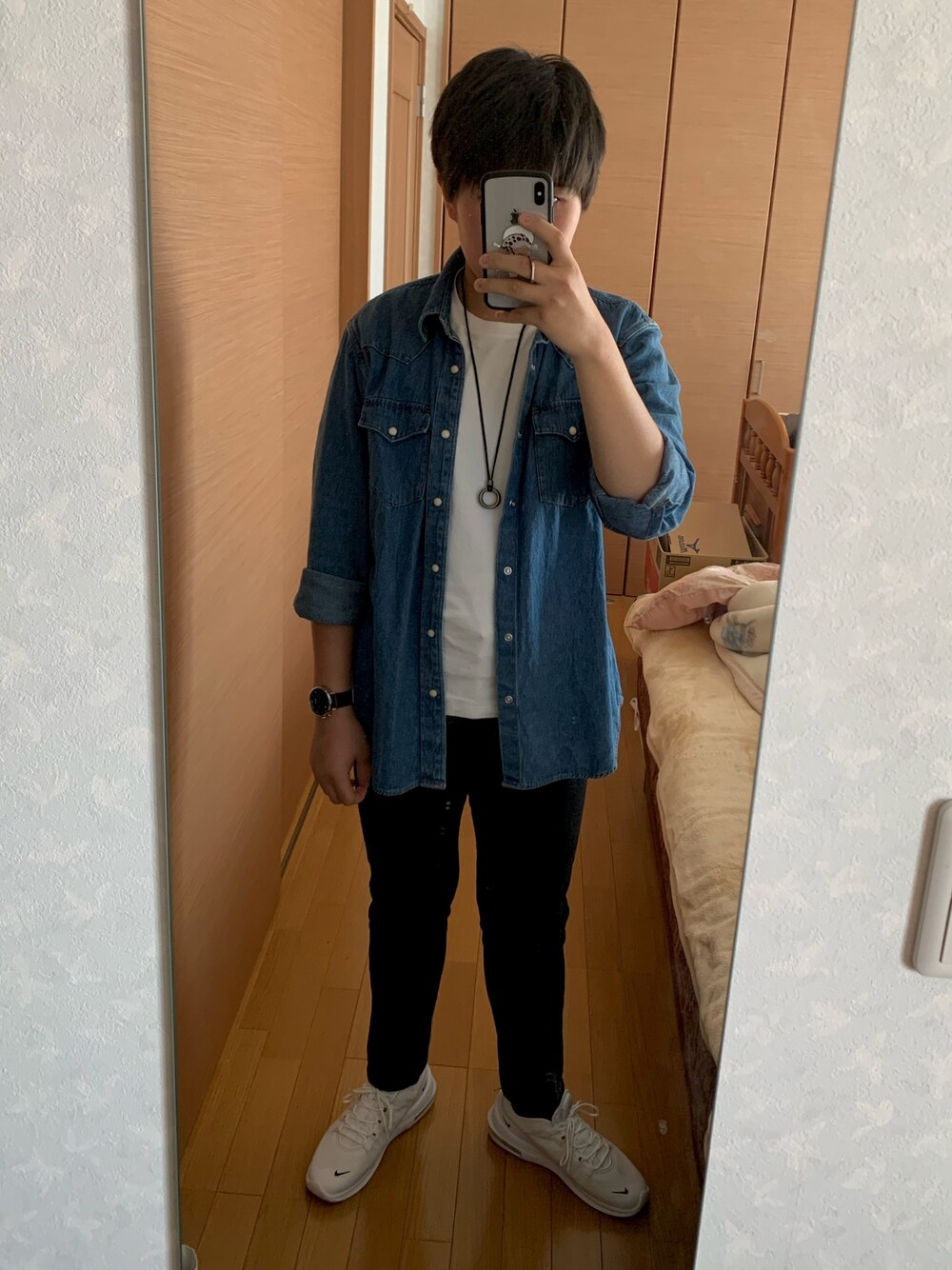 春という事でデニムシャツを着てみました!デニムシャツはインナーとしても使えるので気に入っています。 昨日の投稿でも履いていたNIKEの白スニーカー(エアマックスAXIS)また履いてます。もうあと何回かは履いてると思いますw 良かったらフォローやいいね!などよろしくお願いします🙏