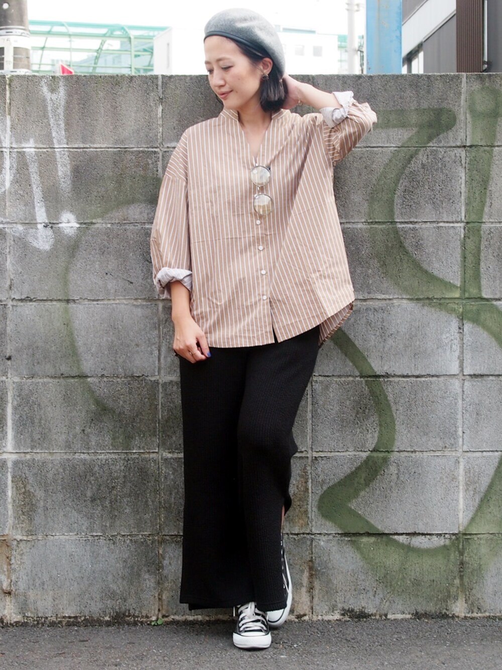 ストライプシャツで いつもより少ししゃんとした気分です🙋🏻 ボトムはサイドスリット入りのリブパンツ🙌🏻 やわらかニットソー生地で 履き心地は極上なのです🤔✨🍁